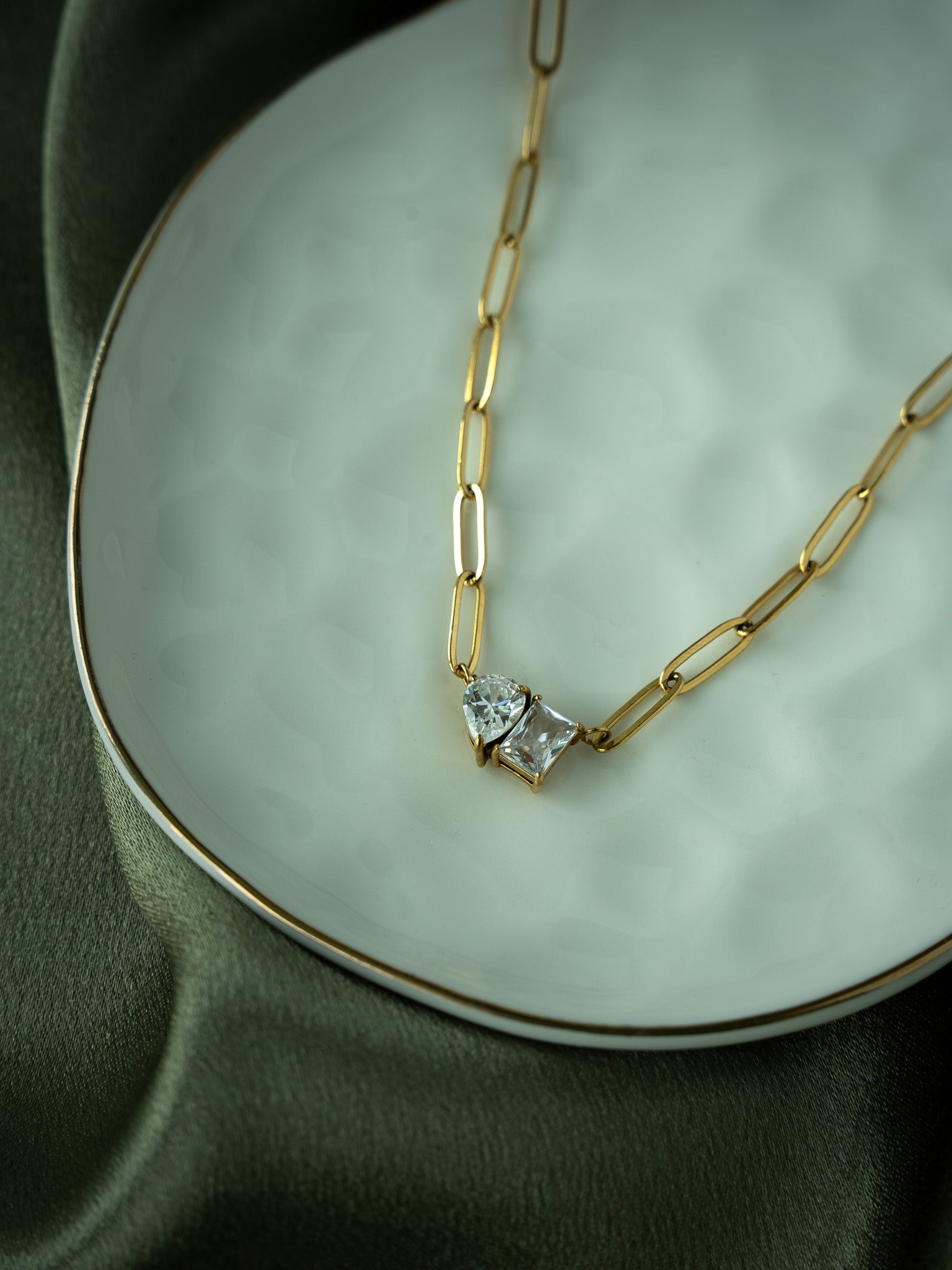 Indulge in opulence with our Audrey Necklace. Made with 18k gold plated stainless steel, this necklace features a polished square and drop zircon stone, evoking a sense of refined elegance. With a paper clip design, it exudes a modern charm. Elevate your style and make a statement with this luxurious accessory.