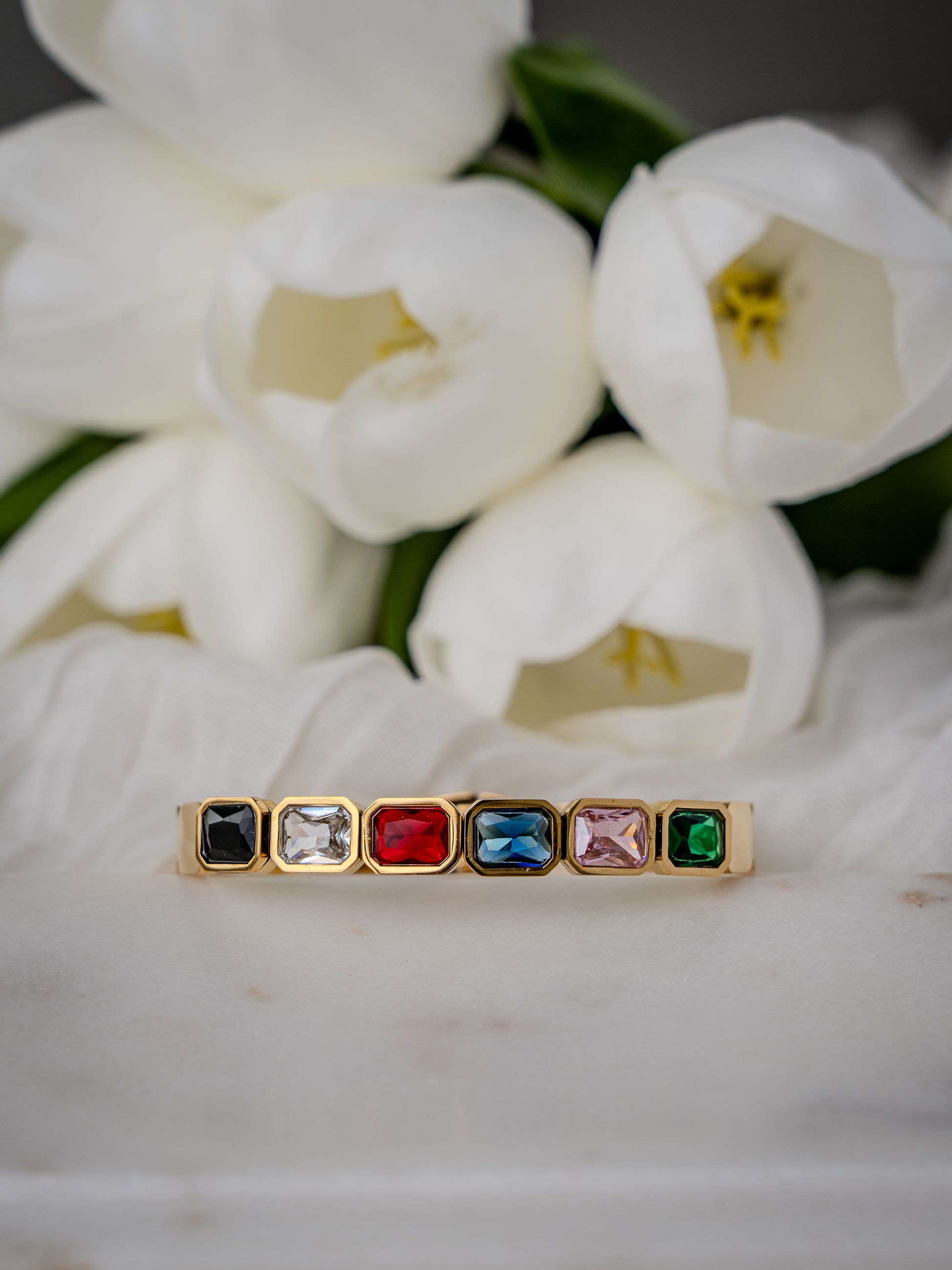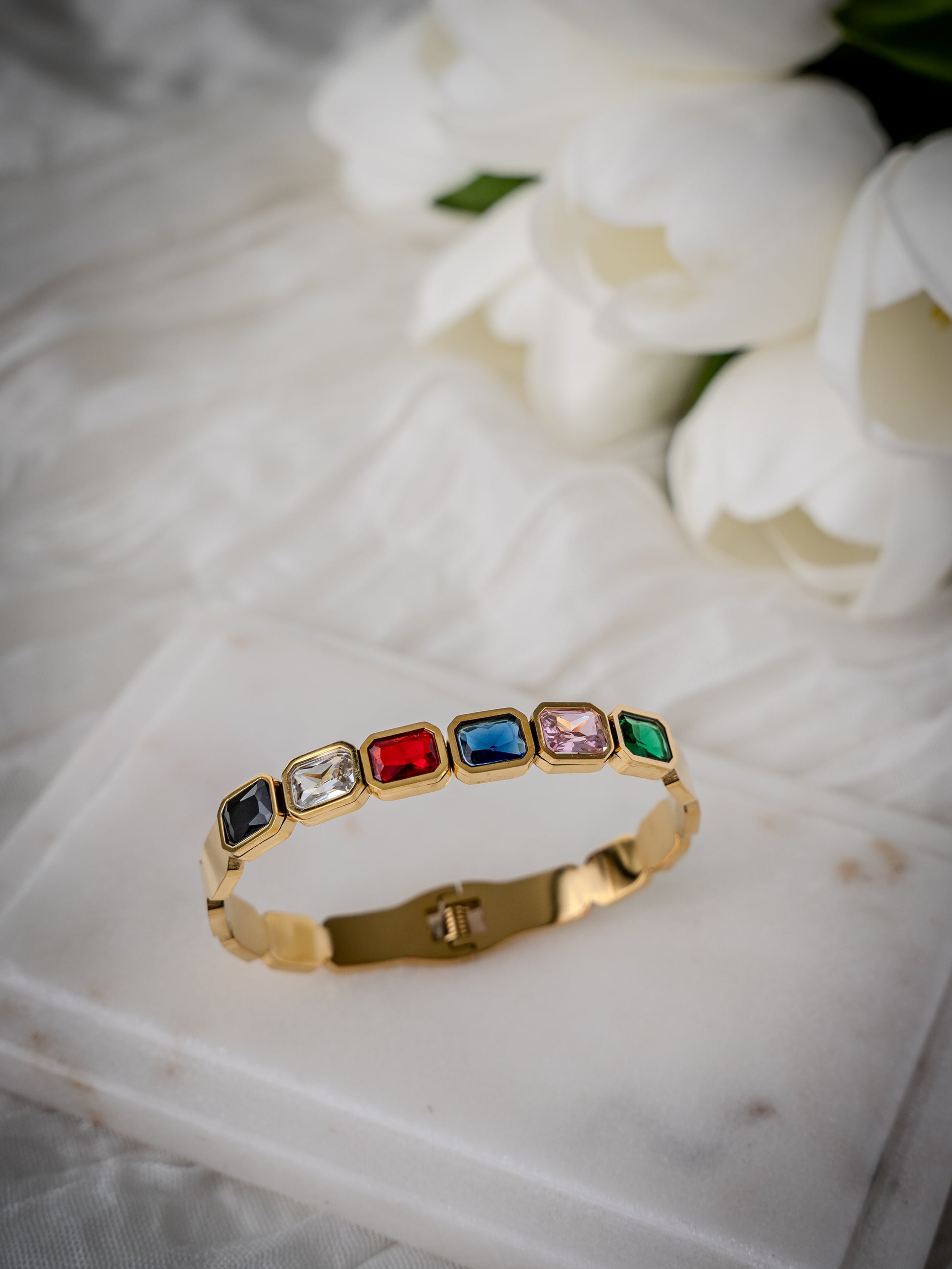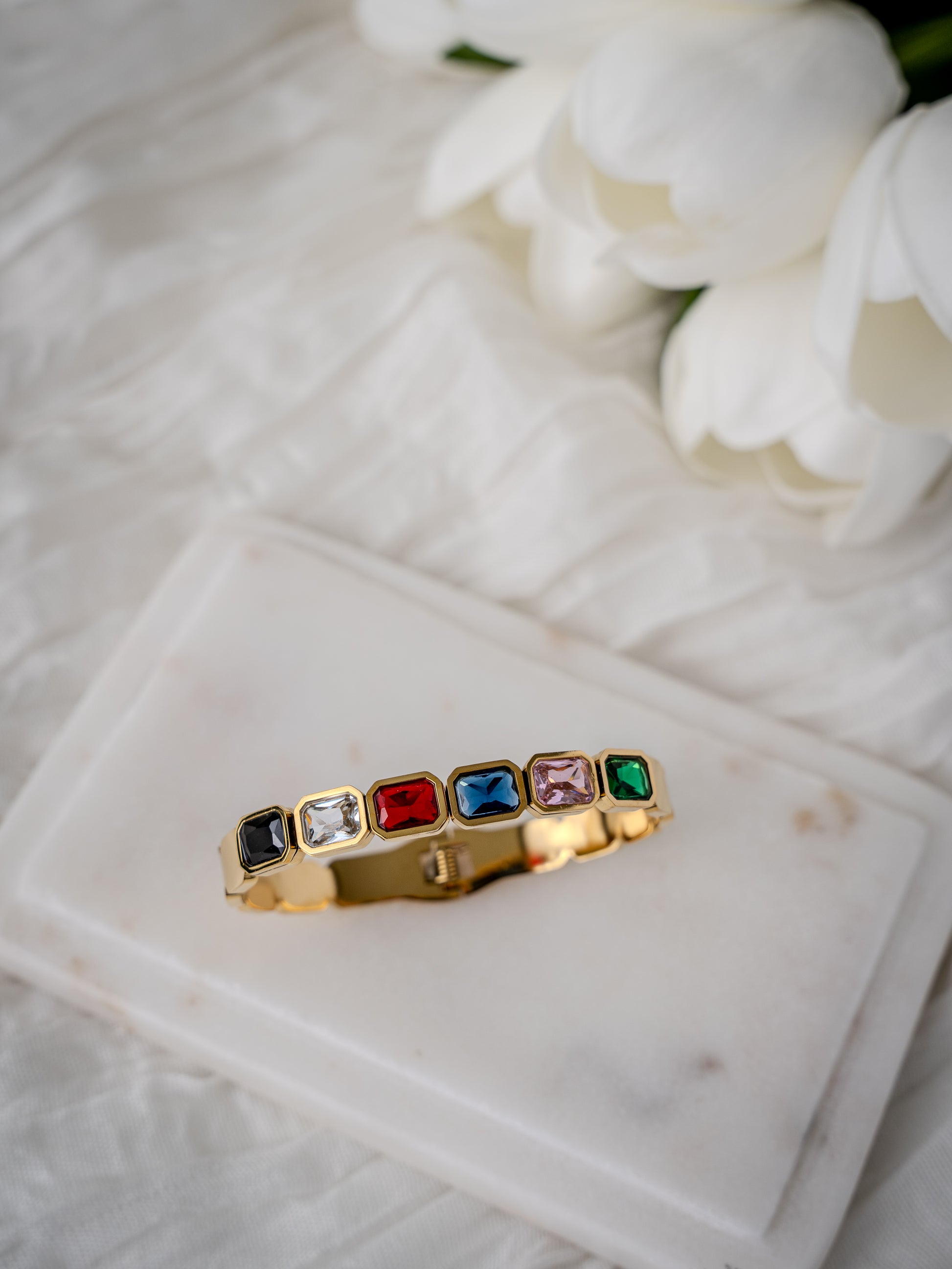 Introducing the Aurielle Bangle - a luxurious statement piece crafted with 18k gold and PVD plated stainless steel. With a high-quality polished finish, this bangle boasts a super shine and is adorned with colorful zircon stones. Elevate your look with this elegant and exclusive accessory.