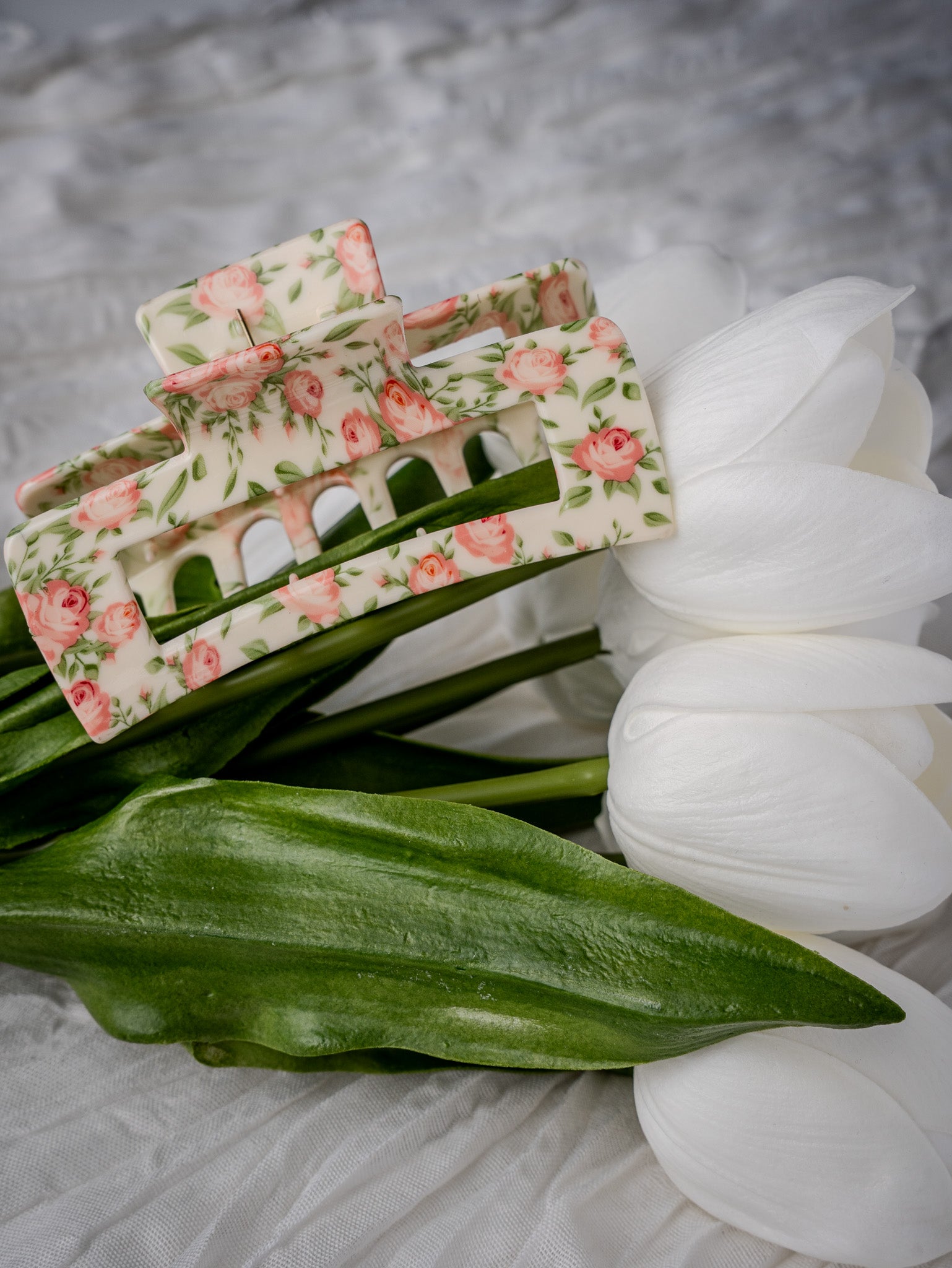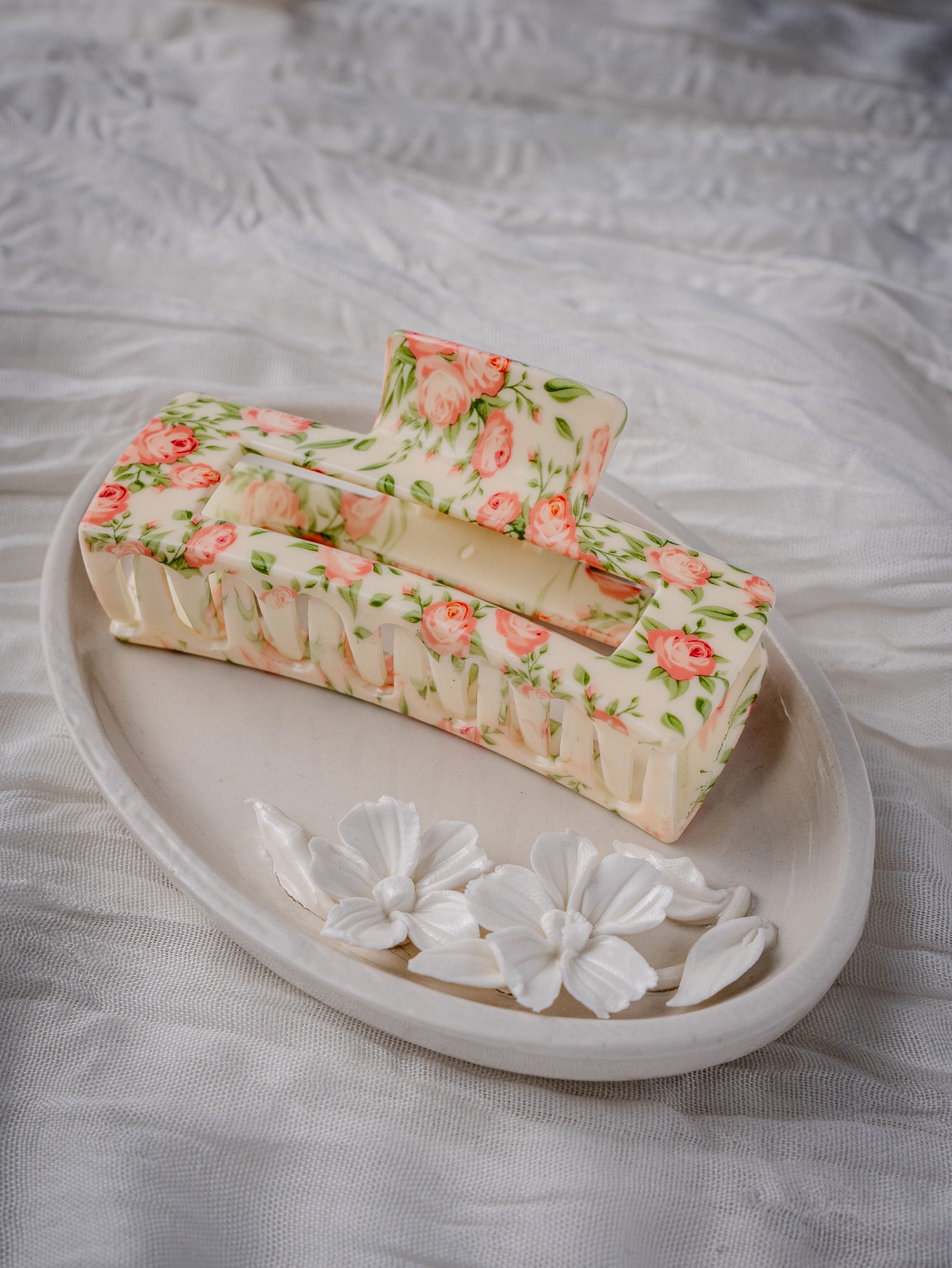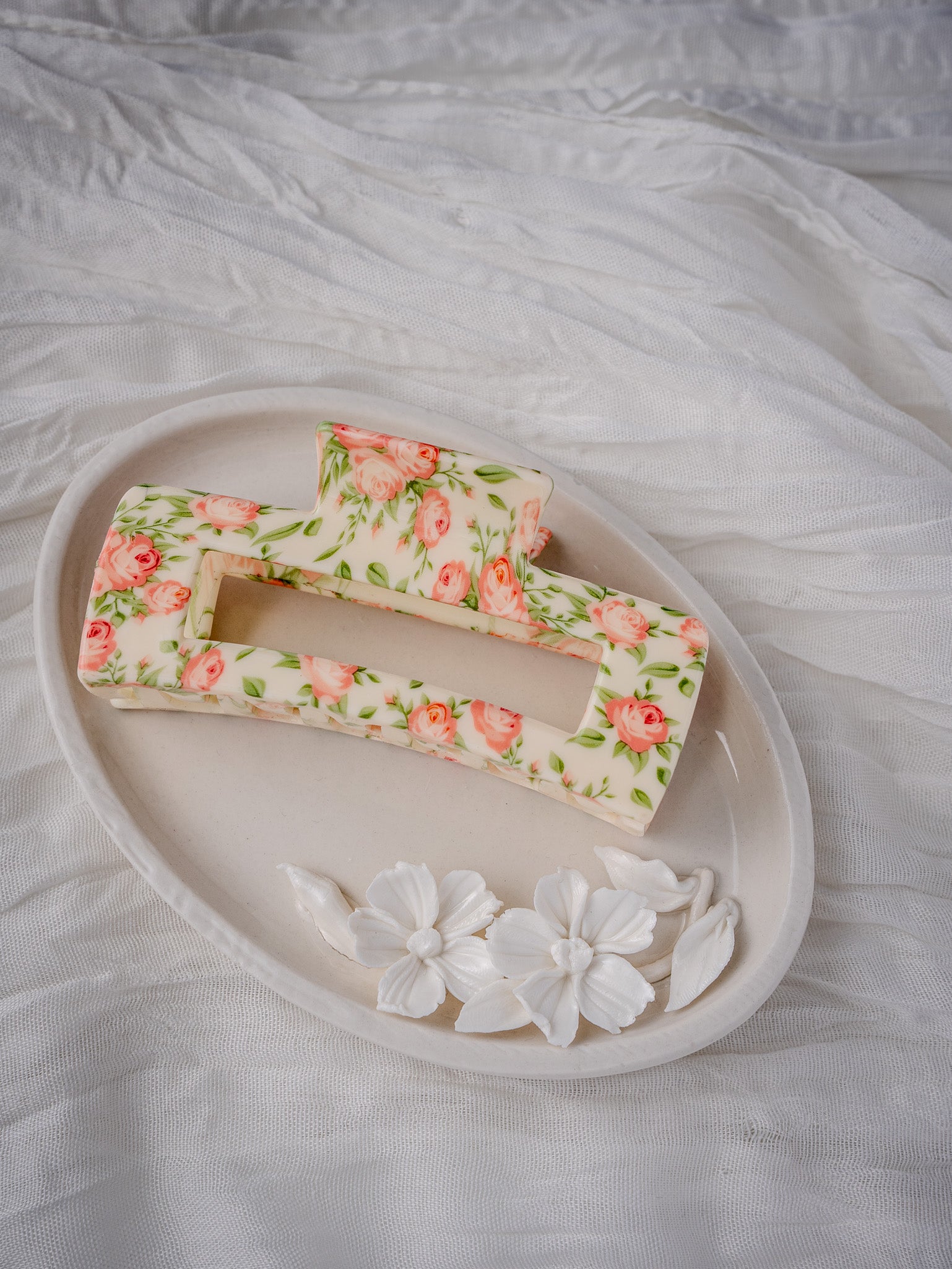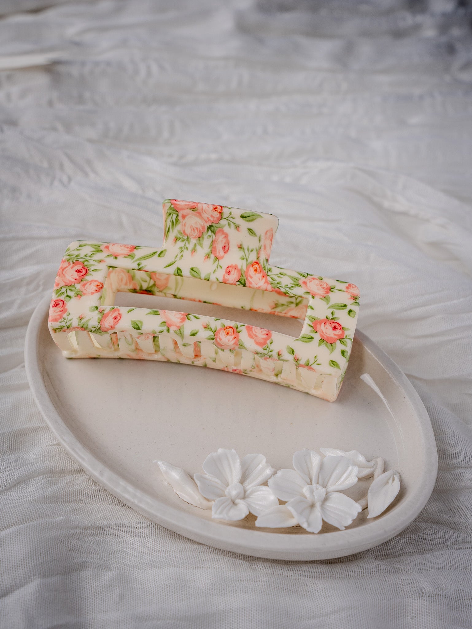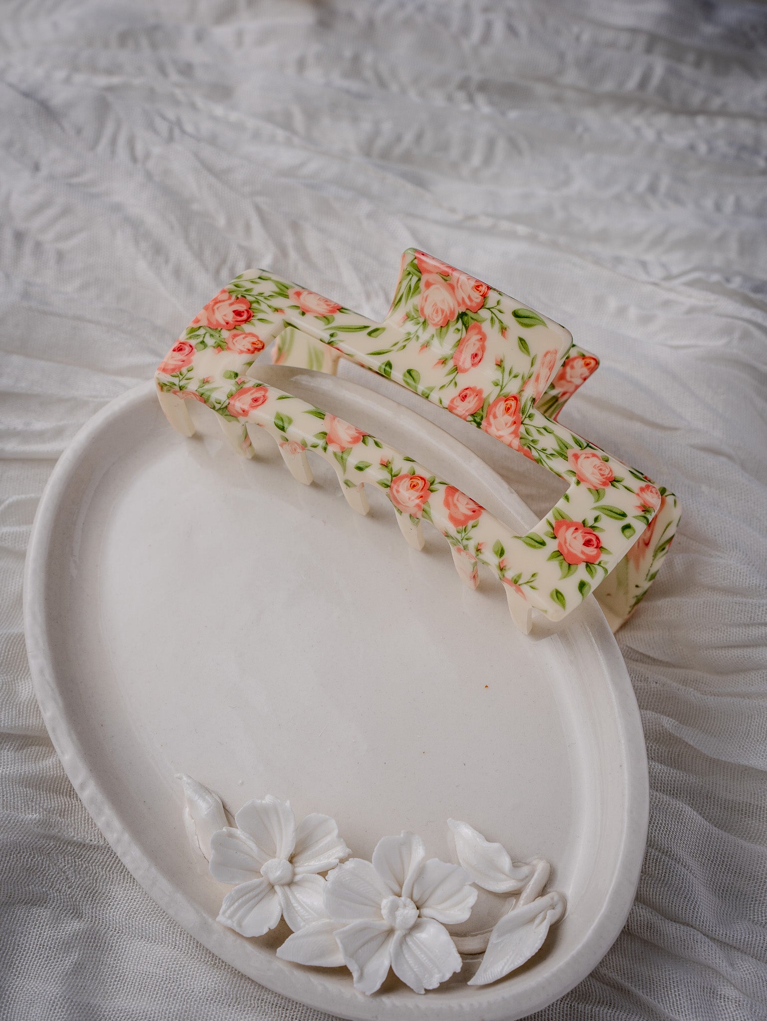 Introducing our Big Flower Claws for women, featuring a sweet flower print in a luxurious cream color with delicate pink flowers. These large hair clips are perfect for achieving an elegant and sophisticated look, adding a touch of art and beauty to your hair.