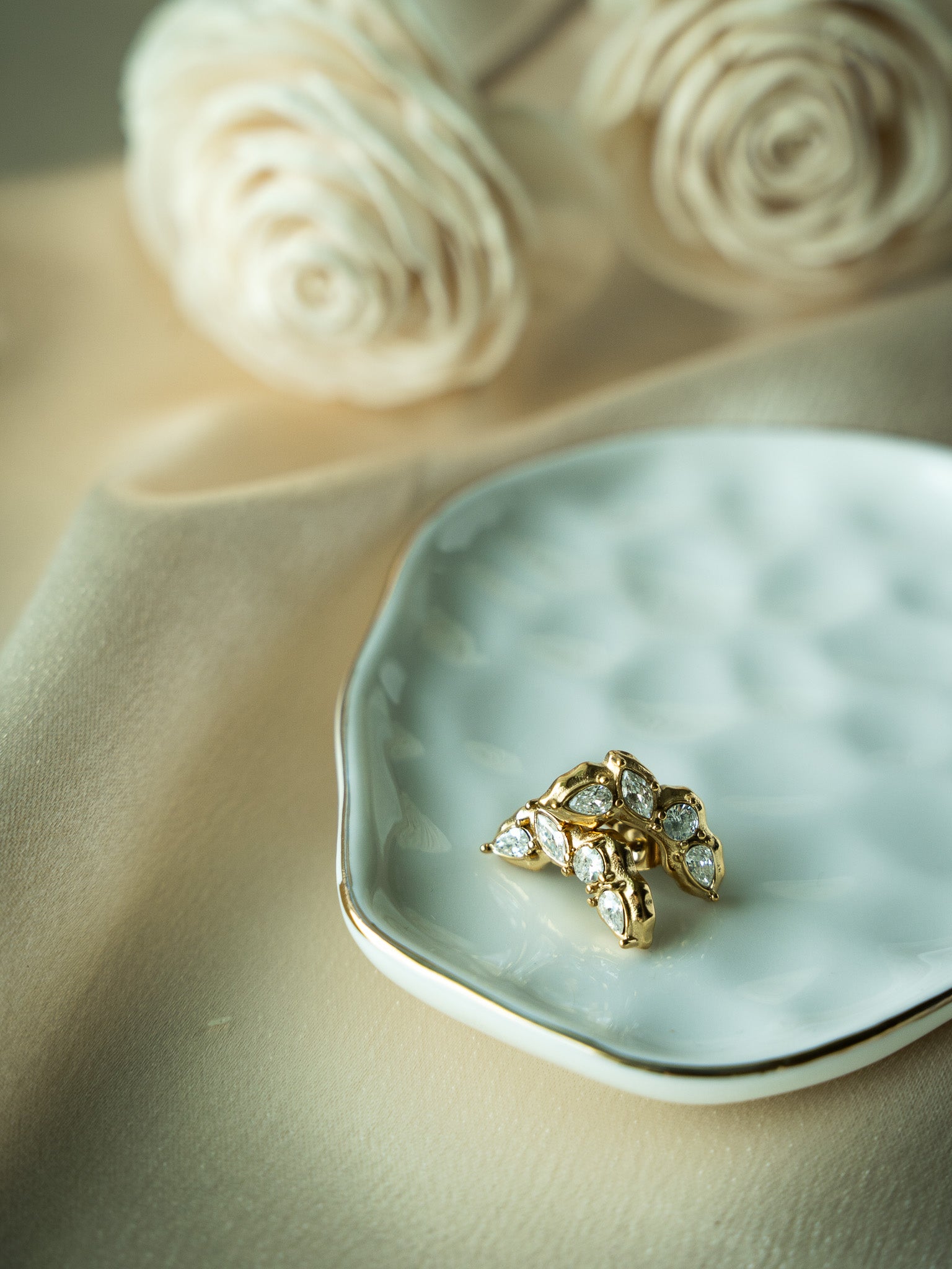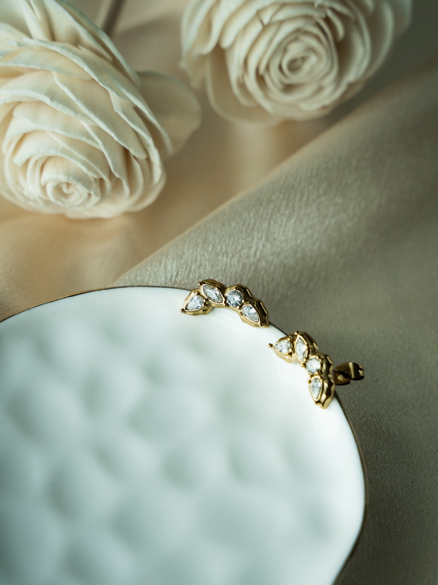 Introducing Bliss Earrings - the epitome of elegance and sophistication. These earrings feature irregularly shaped leaves adorned with shimmering zircon studs. Add a touch of art and luxury to any outfit with these exclusive earrings.