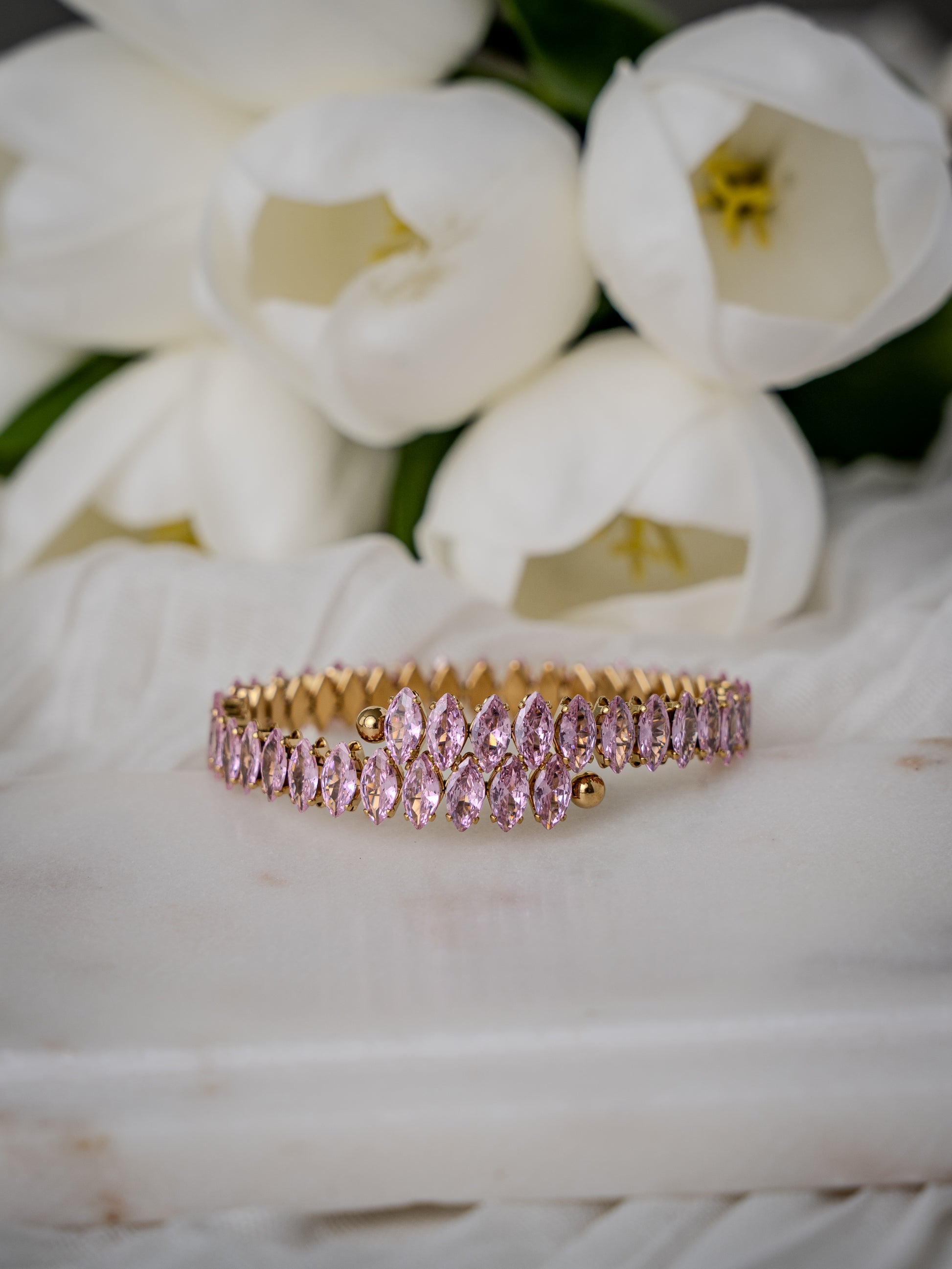 Indulge in luxury with the Blusha Bracelet. This adjustable baguette bracelet adorned with pink shining zircon is the perfect touch of elegance. Made with stainless steel, it's a durable and stylish bangle for the sophisticated woman. Elevate any outfit with this exclusive piece.