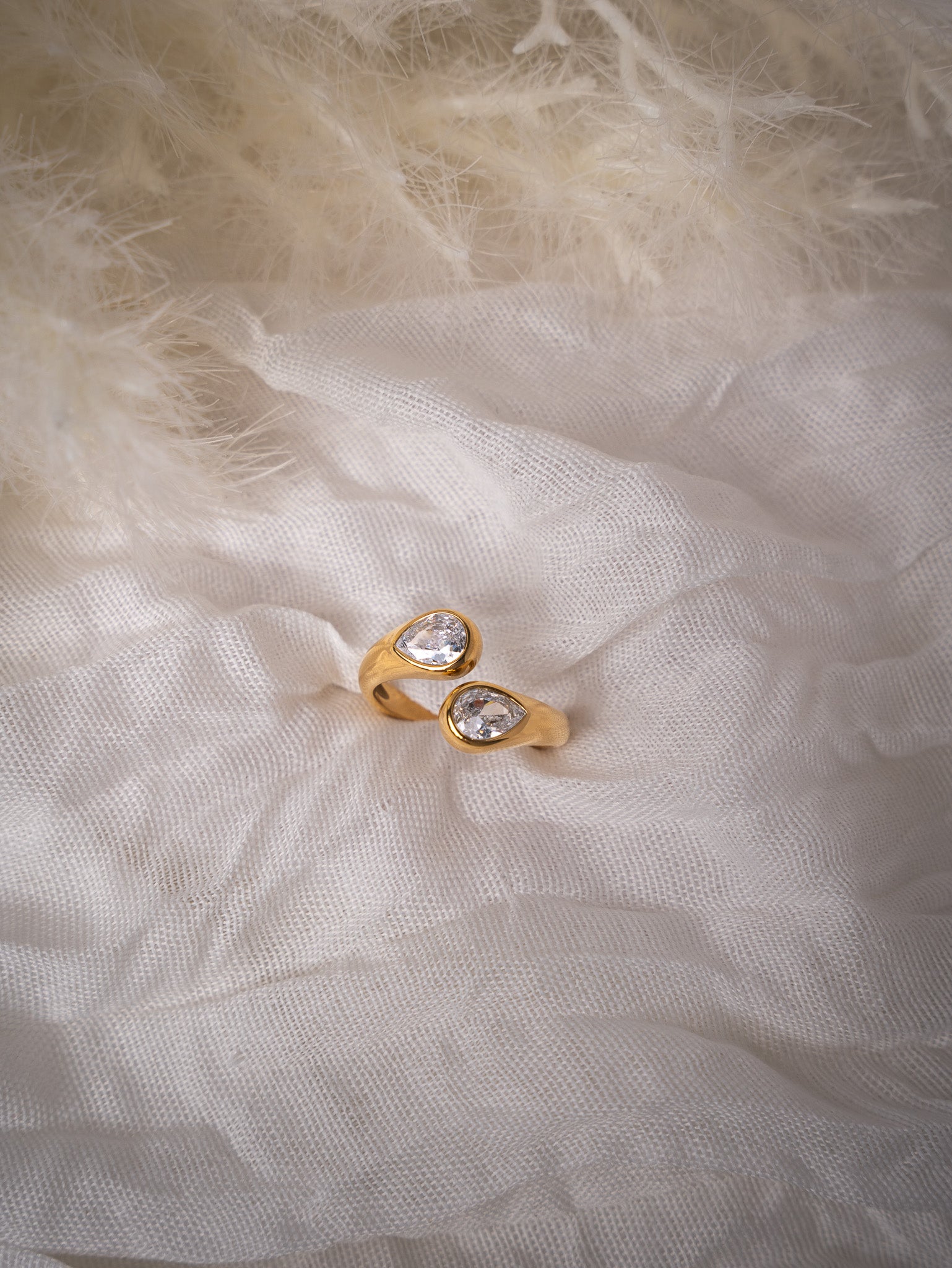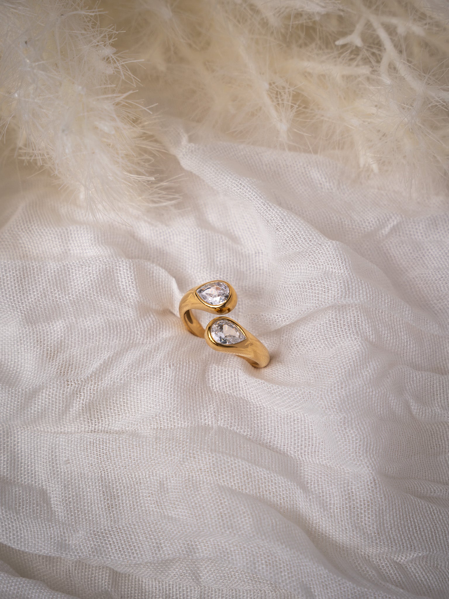 The Deuxia Ring features 18K PVD gold-plated stainless steel with two delicate zircon stones. Waterproof and adjustable, this sophisticated piece resists tarnishing while maintaining its elegant appeal. Perfect for everyday wear or special occasions.