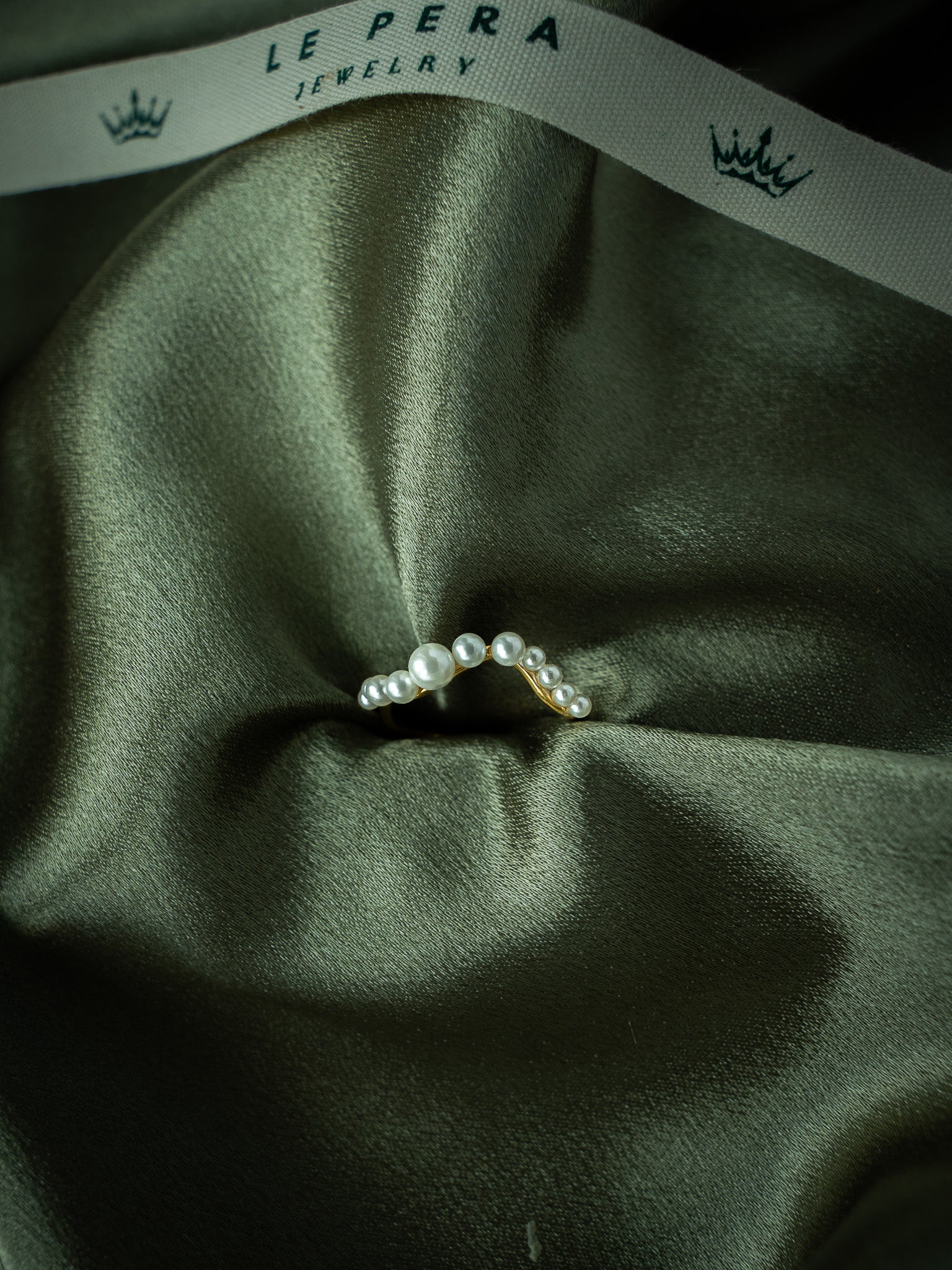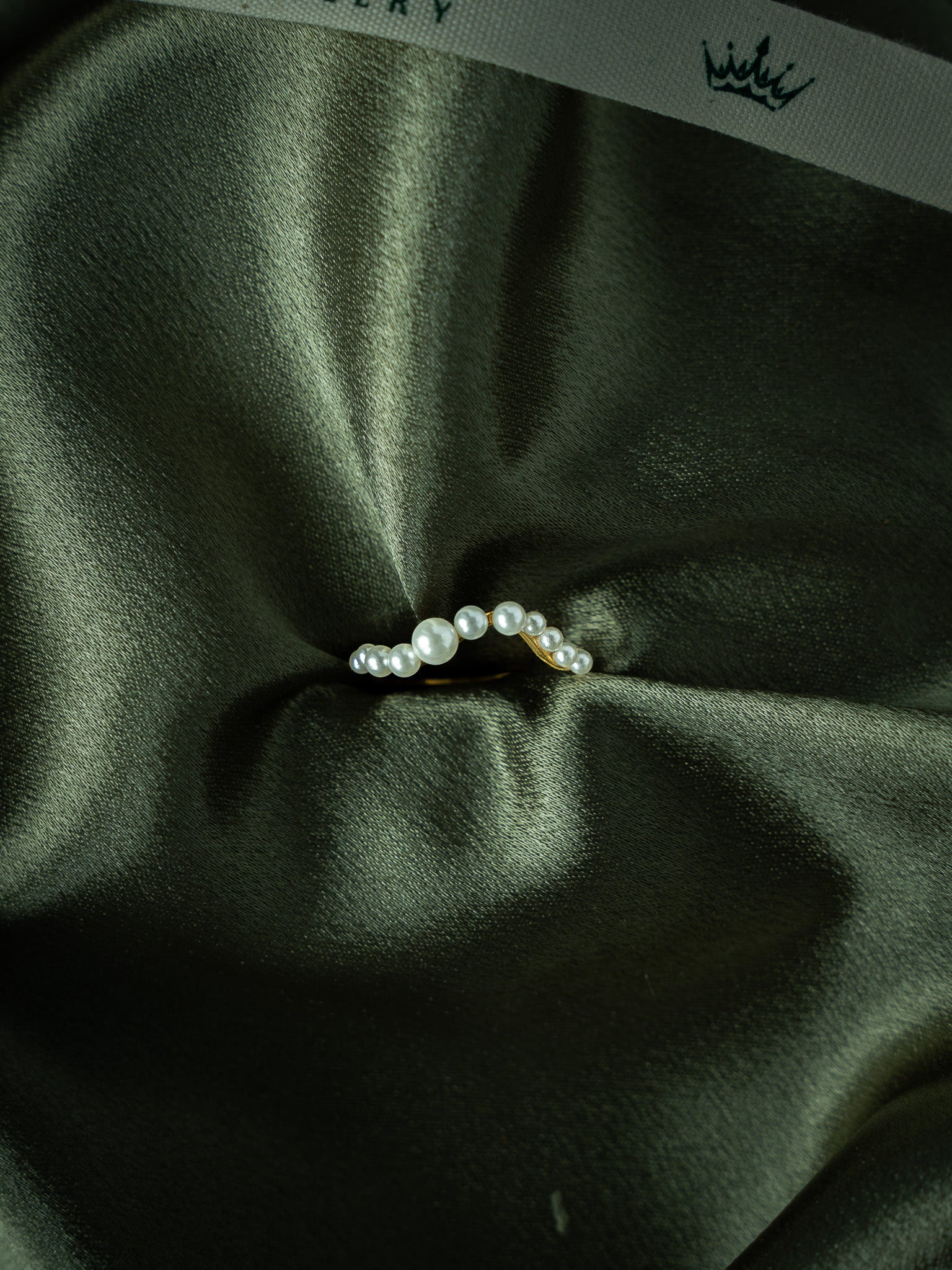 Elevate your look with our Divine Ring. Made of stainless steel and 18K gold plating, it exudes sophistication. The waved design and single row of pearl beads add a touch of luxury. Perfect for any occasion, this ring is a stylish and elegant addition to your jewelry collection.