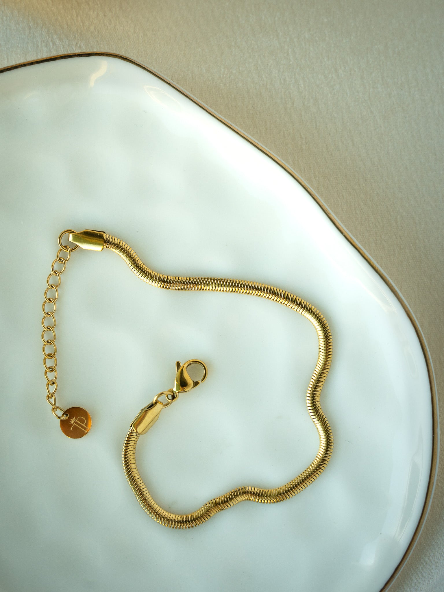 Indulge in luxury with our Empress Bracelet. Crafted with 18K PVD gold plating, this 3mm flat snake chain bracelet exudes elegance and sophistication. Perfect for women who desire a touch of opulence in their jewelry collection. Elevate your style with this wholesale 18K gold plated bracelet.