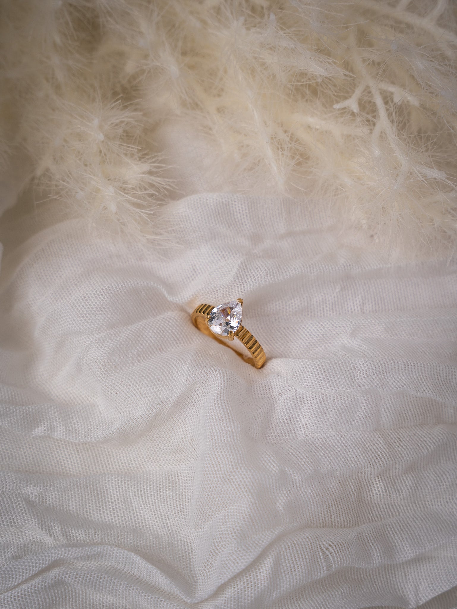 The Lumé Ring features 18k gold PVD plating with a stunning teardrop zircon accent. Waterproof and tarnish-resistant, this elegant band ring maintains its sophisticated shine through everyday wear and special occasions alike.