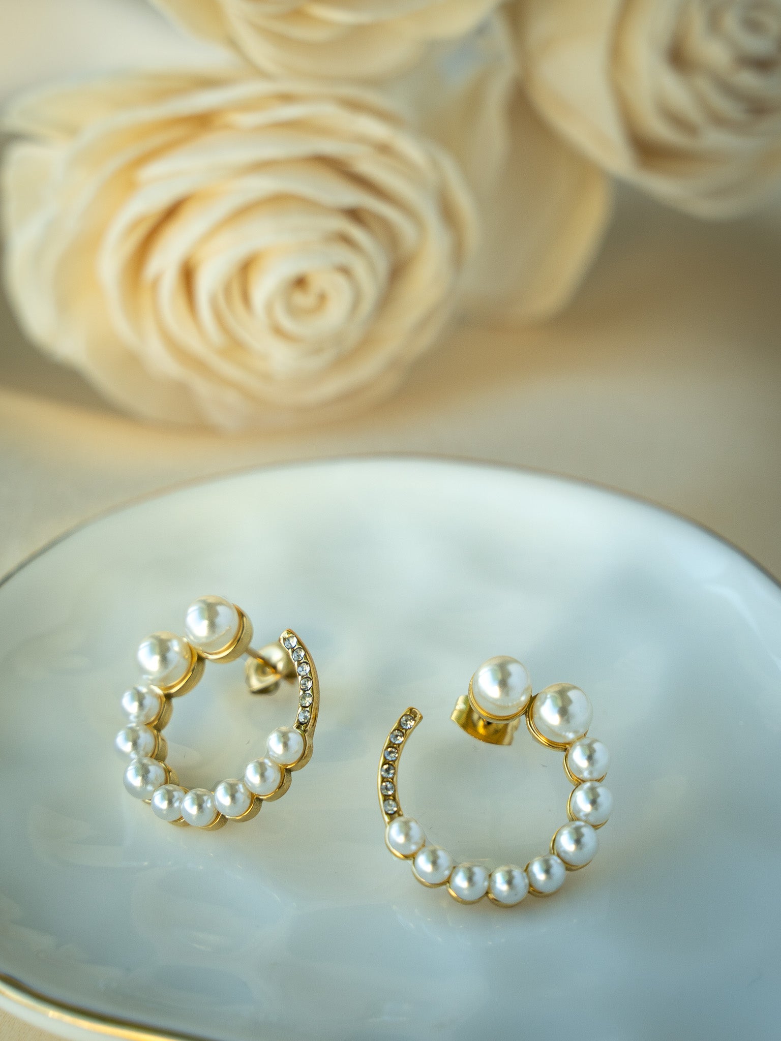 Add a touch of elegance to any outfit with our Opalina Earrings. Handcrafted with 18k gold plated hypoallergenic stainless steel, these vintage-inspired earrings feature a unique c-shaped design adorned with sparkling zircon gems and a lustrous imitation pearl. Perfect for sensitive ears and sophisticated tastes.