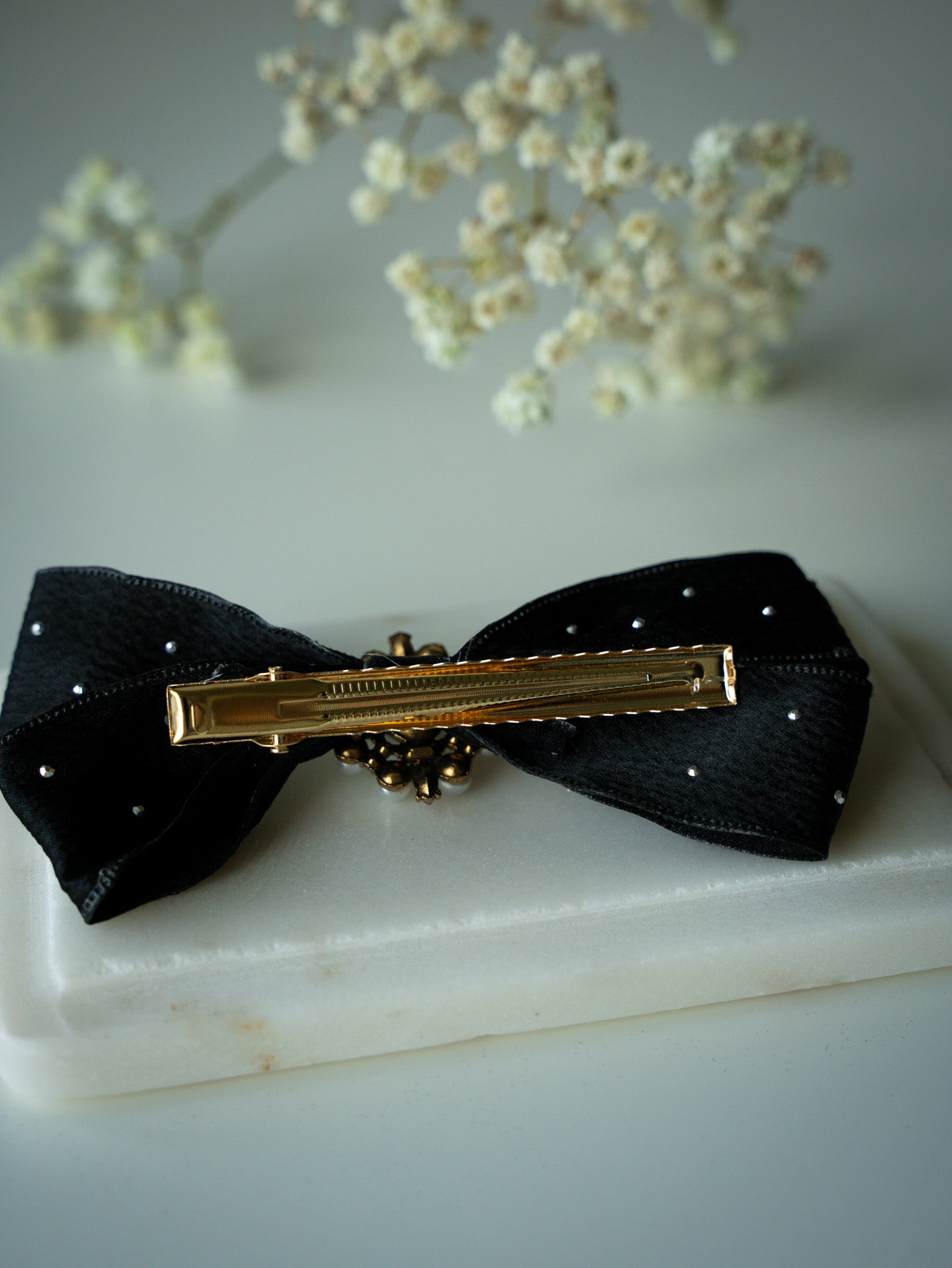 Indulge in opulence with Pearl Elegance, a boutique headdress featuring a delicate bow adorned with sparkling rhinestones. This fancy hair clip adds a touch of glamour to your ponytail, while the pearl and champagne hues evoke a sense of luxury and sophistication. Perfect for special occasions and elegant affairs.