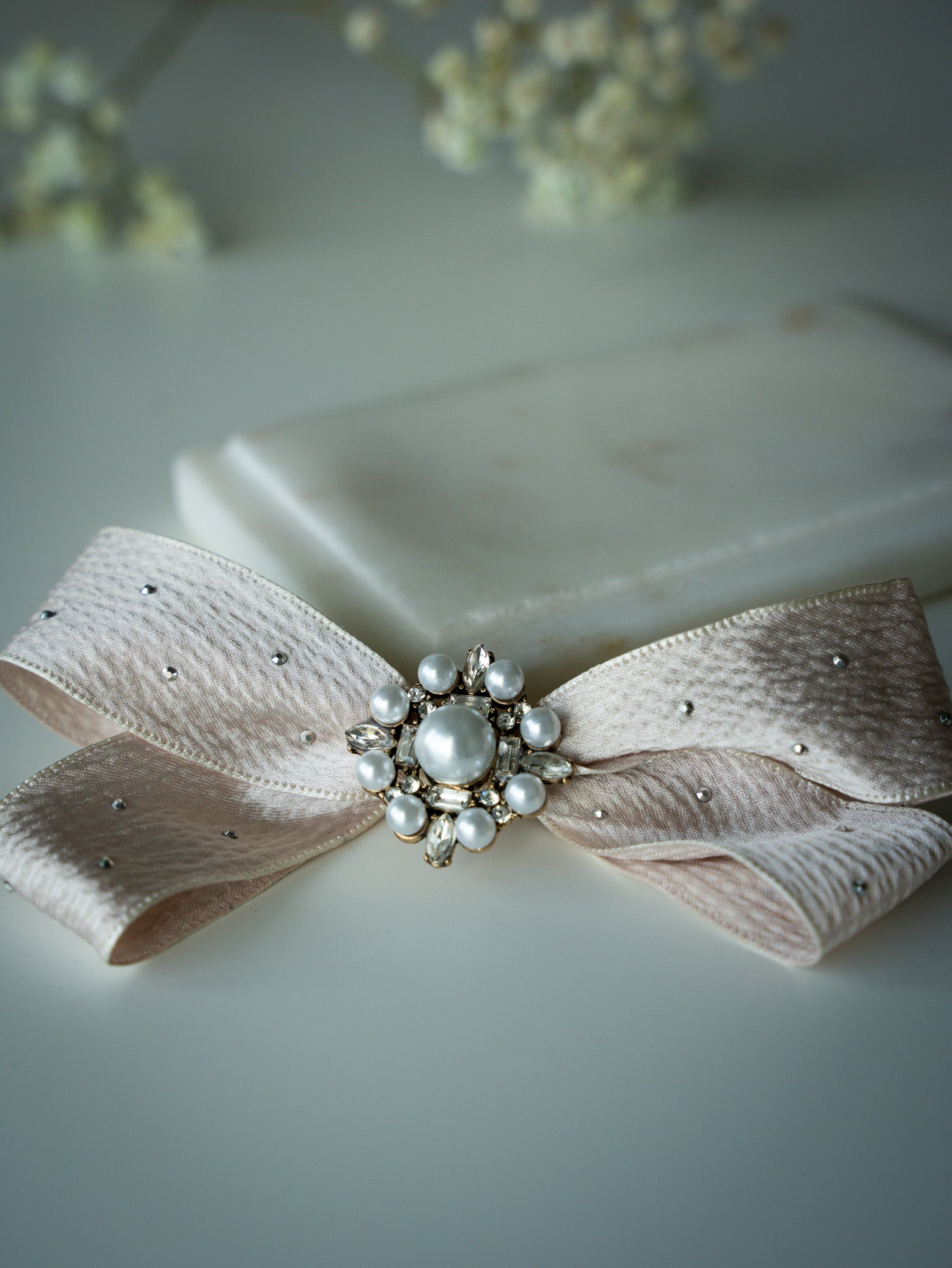 Indulge in opulence with Pearl Elegance, a boutique headdress featuring a delicate bow adorned with sparkling rhinestones. This fancy hair clip adds a touch of glamour to your ponytail, while the pearl and champagne hues evoke a sense of luxury and sophistication. Perfect for special occasions and elegant affairs.