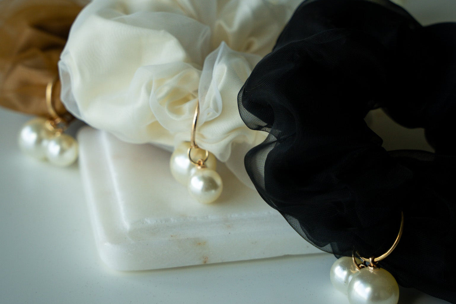 Indulge in luxury with our elegant Pearl Scrunchie. Handmade with delicate pearls, this fashion-forward hair tie is perfect for adding a touch of sophistication to any hairstyle. The elastic design ensures a comfortable fit and the intricate pearls elevate any look. Elevate your hair game with our Pearl Scrunchie.
