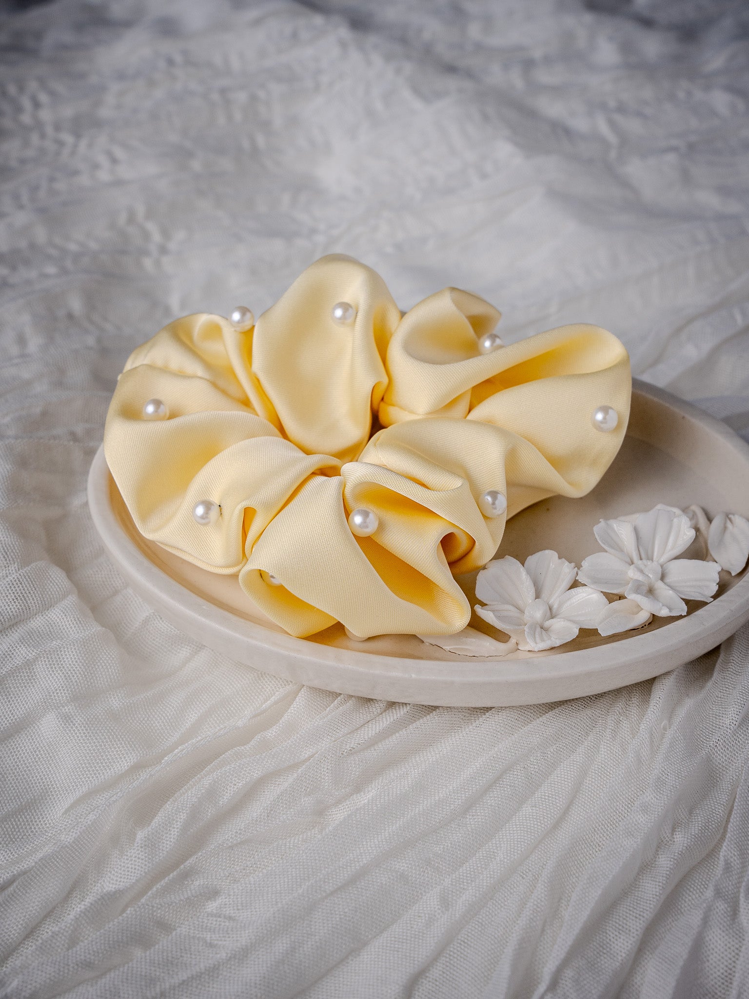 Add a touch of elegance to your hair with our Pearlie Scrunchies in Butter Cream, made from pure satin fabric with high-quality pearls. The silk-like and high elasticity of these simple hair accessories will add a luxurious feel to any hairstyle. Elevate your look with these sophisticated scrunchies.