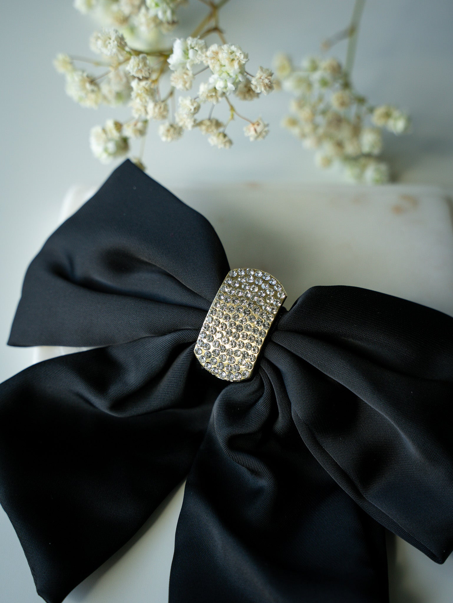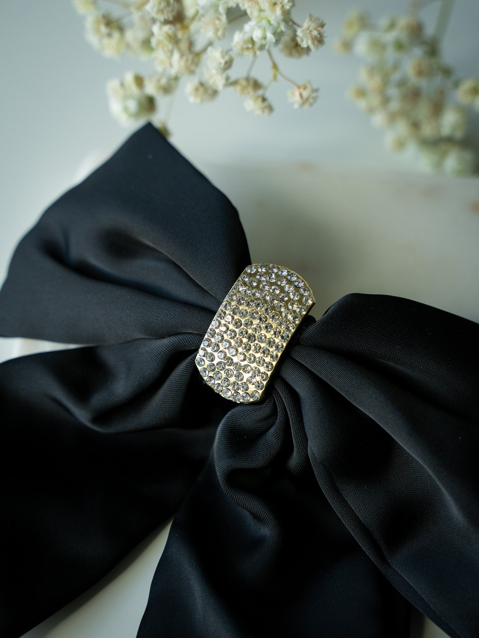 Elevate your look with Satin Glam - Black. Made with luxurious satin and adorned with thick rhinestones, these hair bows add an elegant touch to any outfit. Perfect for winter and the holiday season, these clips give off a sophisticated and exclusive vibe.