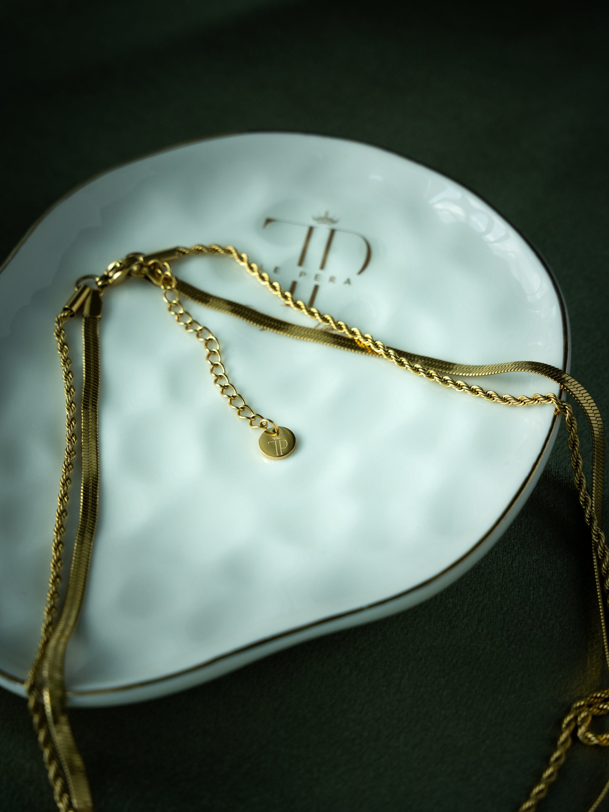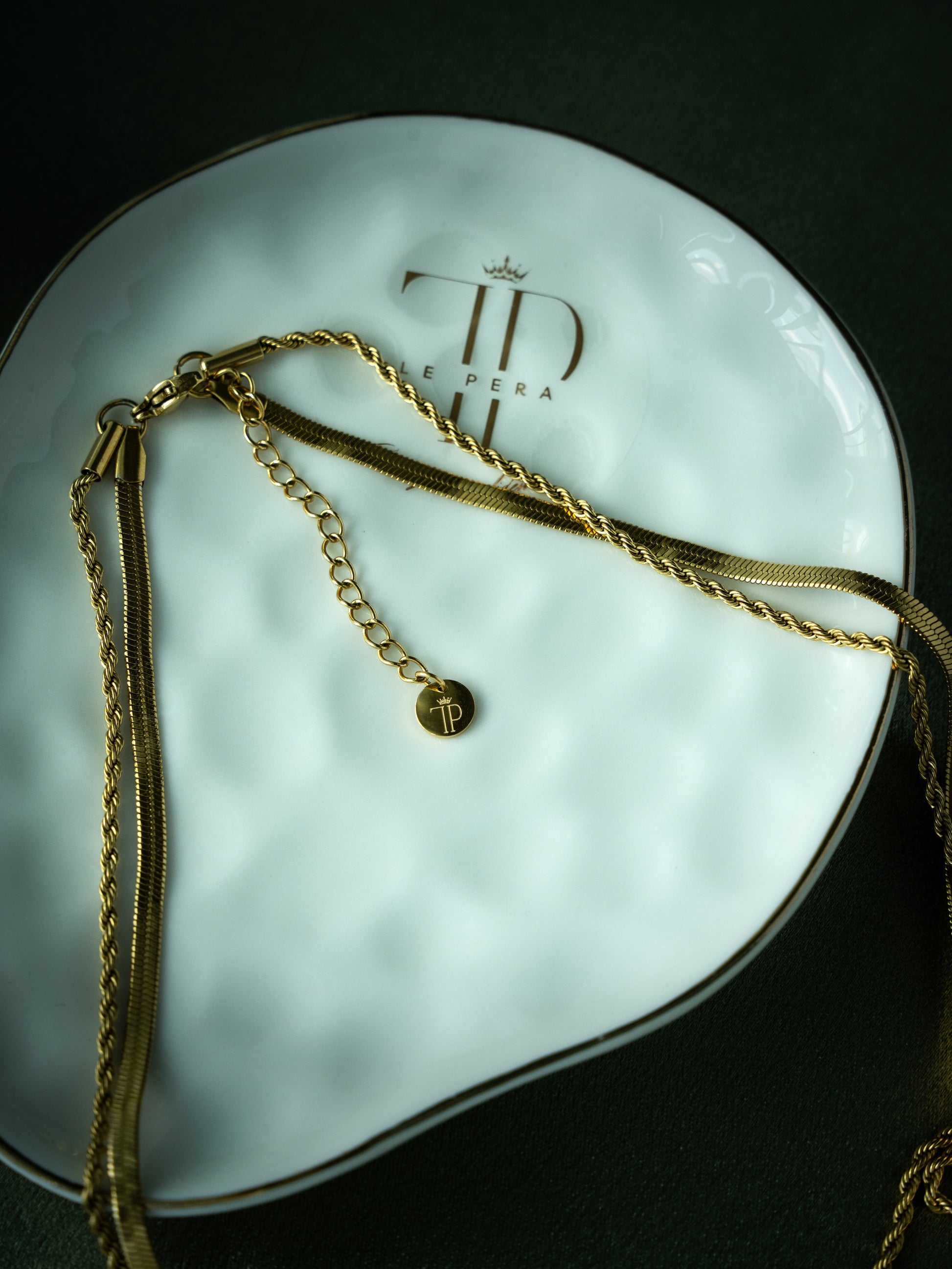Indulge in serendipity with our exquisite necklace. Its double layer design features a sleek stainless steel flat chain and a delicate rope chain, perfect for layering and adding a touch of elegance to any outfit. Elevate your style with this unique piece.