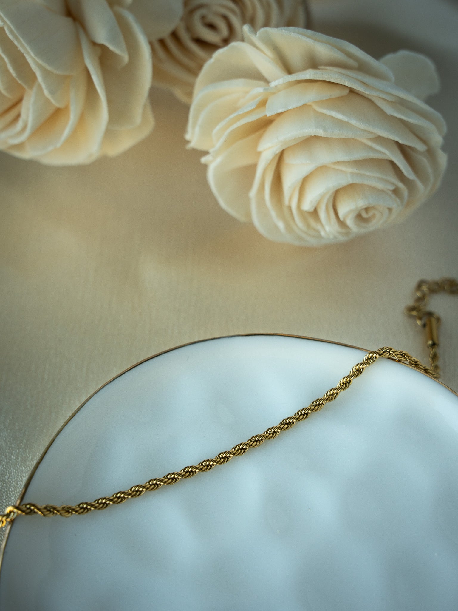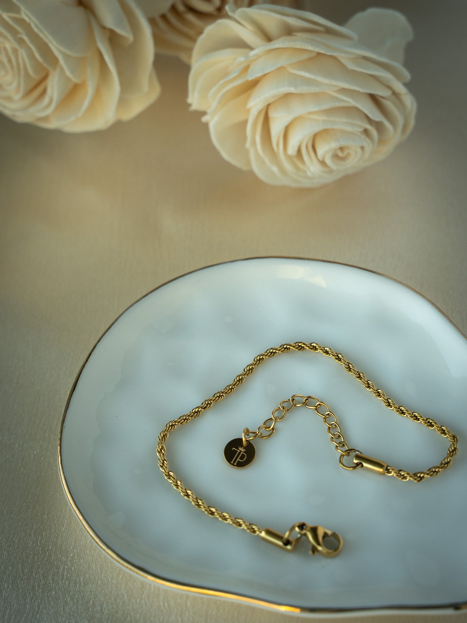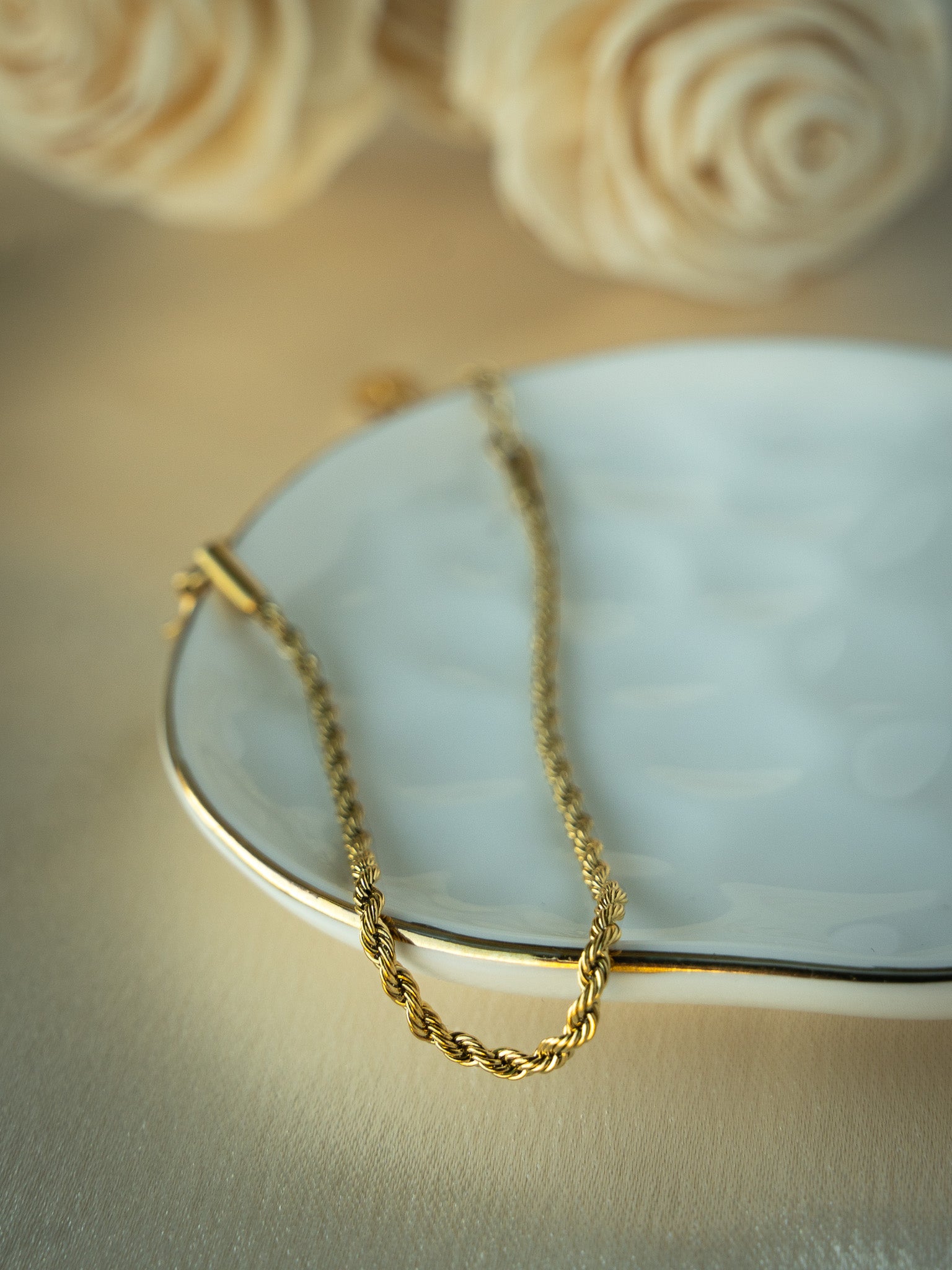 Elevate your style with the Valor Bracelet. Crafted from high-end 18K gold PVD plated stainless steel, this twisted thin 2mm rope bracelet adds a touch of luxury to any outfit. Its minimal design exudes sophistication and elegance, perfect for the refined woman. Make a statement with the Valor Bracelet.